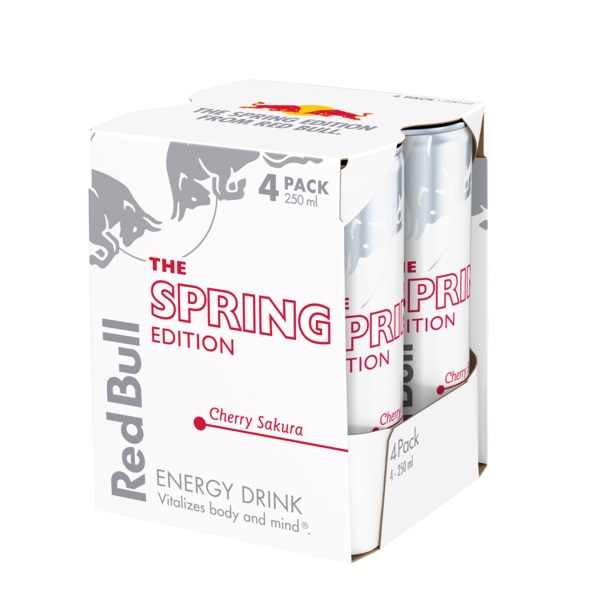 Red Bull Spring Edition with the taste of Cherry Sakura is a full sugar variant, and available now, in single 250ml (plain and PMC) 355ml and 473ml (plain and PMC) cans, as well as 4 x 250ml can multipack.